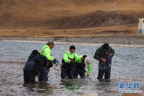 三江源國家公園治多生态環保協會(huì)的(de)志願者在清理(lǐ)河道内的(de)垃圾(7月(yuè)11日攝)。新華社發
